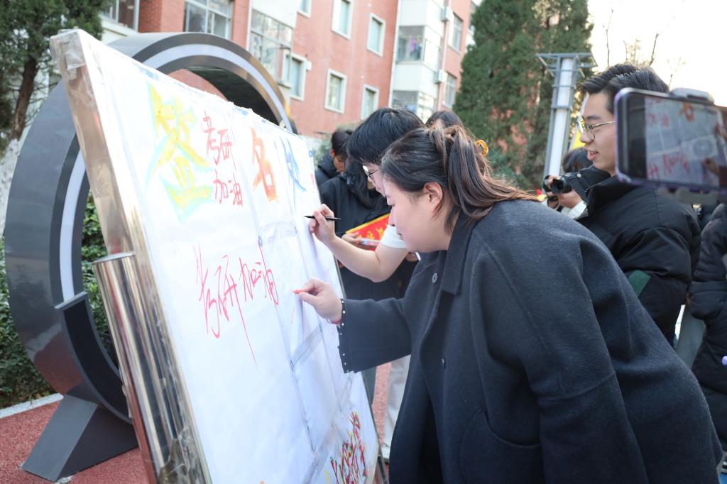 活动以轻松有趣的互动环节拉开序幕,迅速点燃现场气氛。“同学,加油!”两只憨态可掬的“轻松熊”玩偶穿梭于人群,主动张开双臂,为学子们送上一个个温暖而治愈的拥抱,瞬间抚慰了备考的紧张与疲惫。一旁的彩色“前程似锦”签名墙,则迅速成为焦点,同学们纷纷执笔,郑重签下姓名,并写下“一战成硕!”“金榜题名!”“一定上岸!”等豪迈誓言。一笔一画,汇成闪耀的信念之光;欢声笑语中,大家压力得以释放,信心随之升腾。